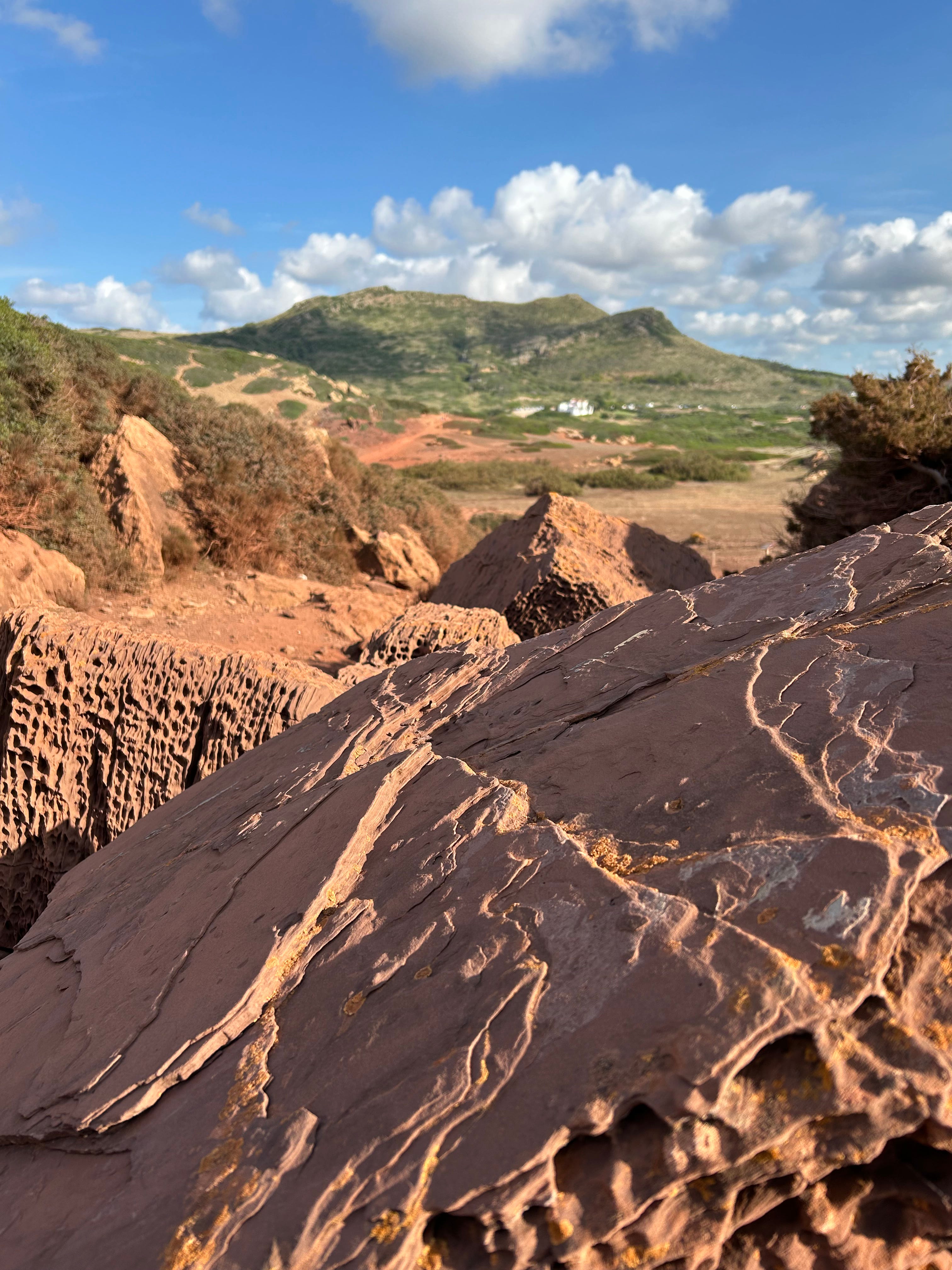 I was so excited to experience this feeling of home in Spain last week, encounter the plant life and weather that I grew up in and walk on the hot dry sun-scorched earth, swim in the sea, experience the scents of aromatic pines and junipers growing along the paths, their fragrance mixing with the salty air. In Menorca, the way the water left patterns and textures in the rocks along the sea is exactly what I described in our Las Canoas pattern, inspired by the same idea, but in the foothills of the Santa Ynez mountains: